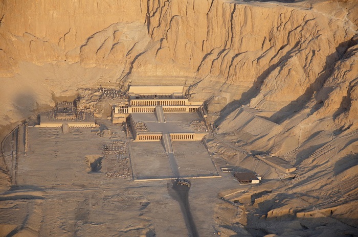 Pharaoh Hatshepsut of Egypt’s 18th Dynasty erected the Temple of Hatshepsut as a mortuary temple. It is considered a masterwork of ancient architecture and is located across the Nile from Luxor. Its three huge terraces soar above the desert bottom and into Deir el-Bahari’s cliffs. The temple’s axes represent the pharaoh’s life cycle from coronation to rebirth: on its main east-west axis, it served to receive the barque of Amun-Re at the climax of the Beautiful Festival of the Valley, while on its north-south axis, it represented the pharaoh’s life cycle from coronation to rebirth.